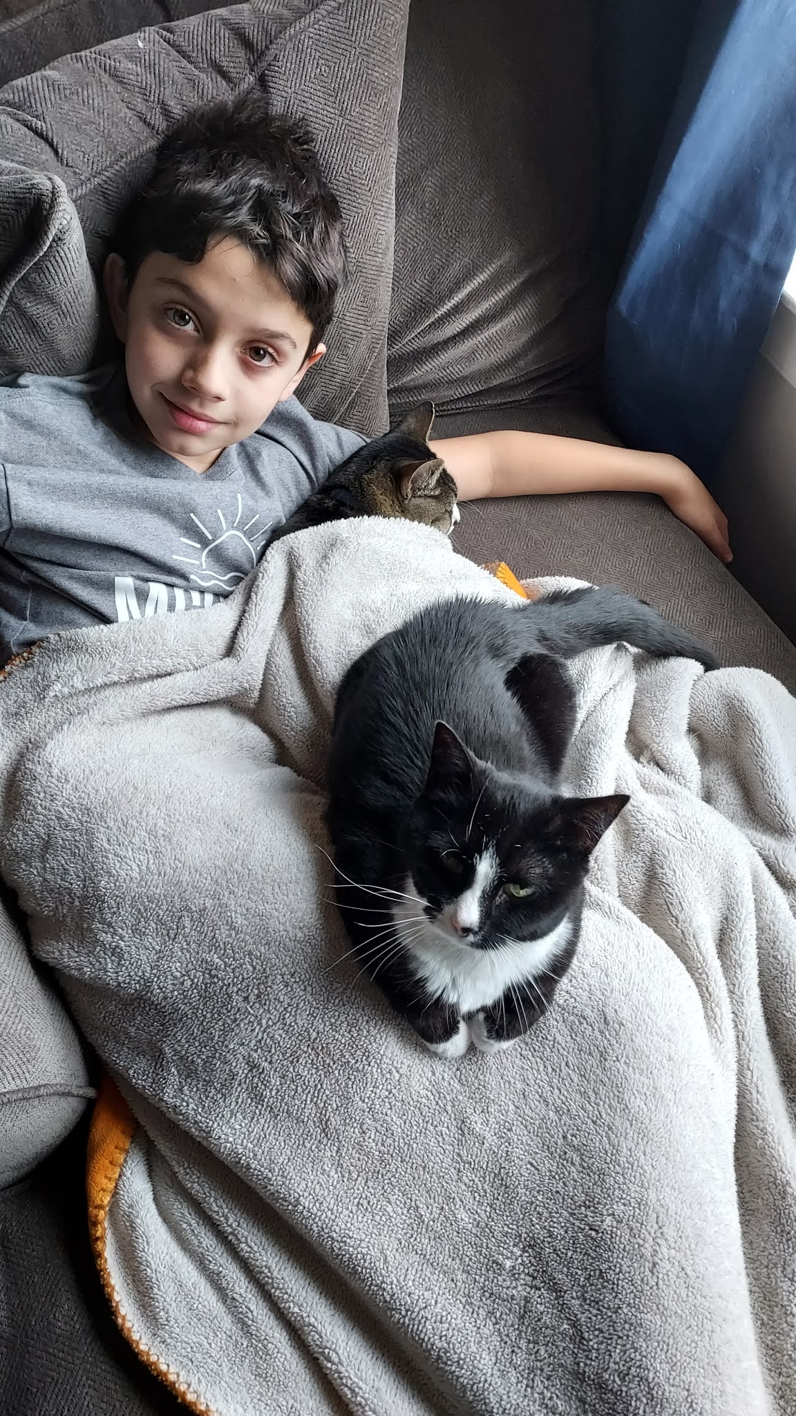 Of course, he'd snuggled in with a pair of cats and didn't want to get up right as it was time to go.