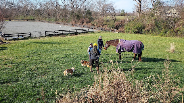 Beau turned around and watched as Carrie came up (and a pair of deer watched in the background).