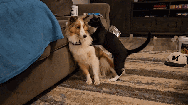 Carrie thinks it's cute and is happy to instigate. Flying cat bomb!