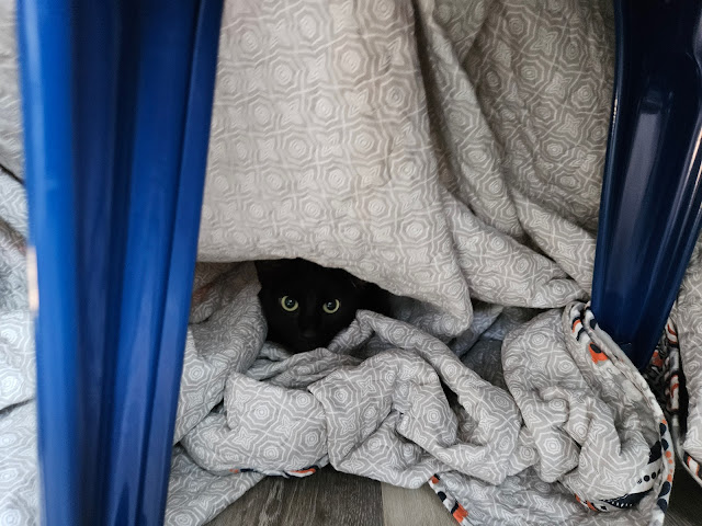 So Pip is a mainstay in the main area now. He gets around, but you still have to check behind you whenever you near the bedroom door. He'll dash in if you're not careful (and then he'll hide under the bed to make it hard to get him back out!).